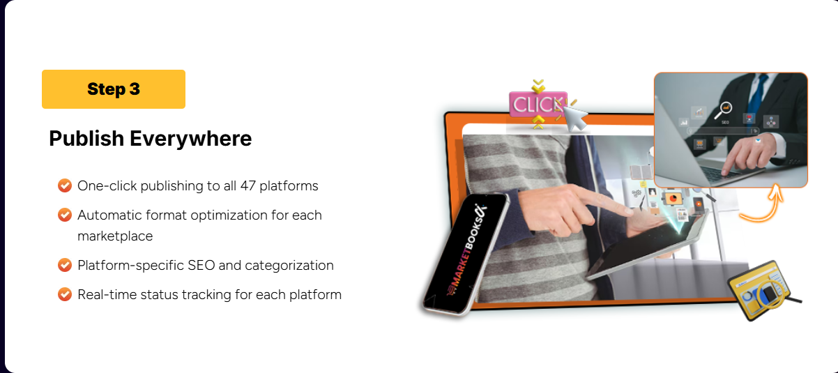 Instead of uploading files manually to dozens of platforms, MarketBooks AI handles format conversion and distribution automatically.